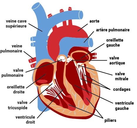 Le cœur est divisé en 4 cavités : 2 oreillettes [atrium (atria au pluriel)] et 2 ventricules. On parle souvent des cavités droites (oreillette droite et ventricule droit) et des cavités gauches (oreillette gauche et ventricule gauche) et donc d’un cœur droit dit veineux (ou capacitif) et d’un cœur gauche dit artériel (ou résistif).